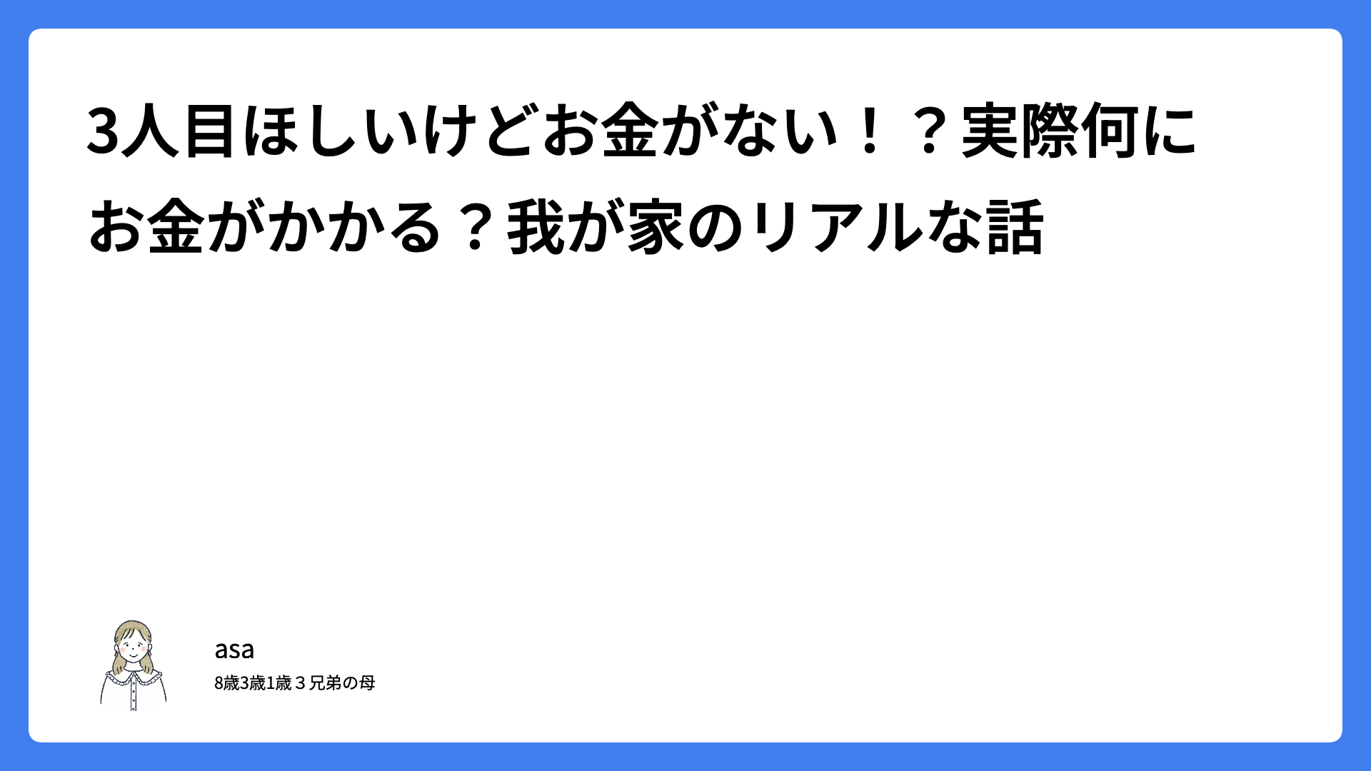 「3人目 欲しいけどお金がない」とスマホで検索して、ため息をついているママに向けて、3人育児中の我が家のお金事情を書いていきます。