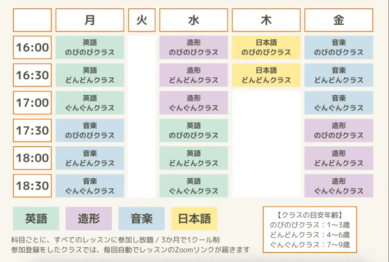 英語・造形・音楽・日本語のクラスができます。3ヶ月1クールなので続けやすい!