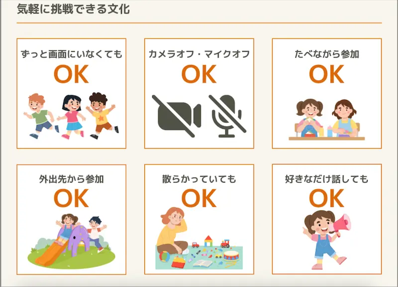 ミュート参加もOKです!それに、画面オフ参加でも大丈夫です。